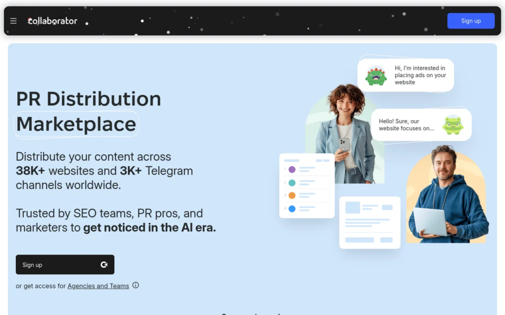 Collaborator positions itself as a marketplace for PR distribution and content placements across websites and Telegram channels. On its public pages, it states “38,000 sites and 3,000 Telegram channels” worldwide, and it highlights inventory verification signals such as “7,000+ websites with real Google Analytics (GA) data” and “5,500+ sites verified by Google Search Console (GSC).”