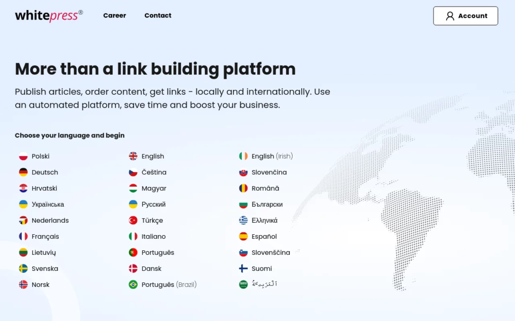 WhitePress describes itself as an automated platform for SEO and content marketing that lets users publish articles in “thousands of portals worldwide,” and it also offers native copywriting services.