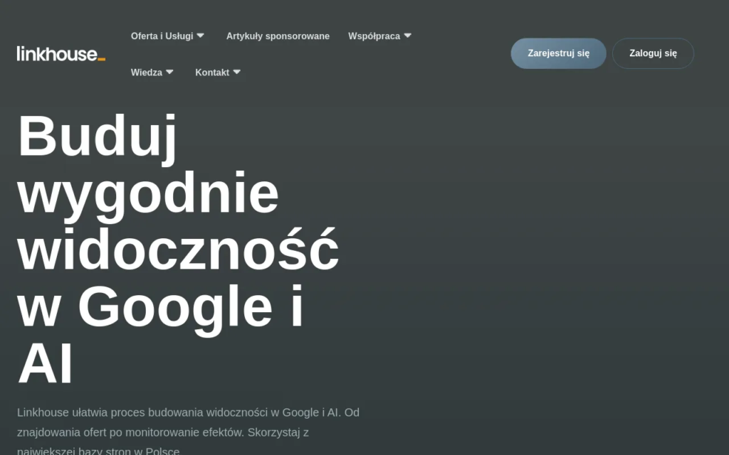 Linkhouse is strongly positioned in Poland and emphasizes sponsored articles and related link-building formats. On its site, it highlights “the largest database of sites in Poland” and frames its offering around finding opportunities, executing placements, and reporting—plus visibility in both Google and AI tools.